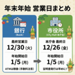 今年は銀行や市役所はいつまで営業しているかChatGPTとGeminiに聞いてみました。答えは以下の通り。 ChatGPT はい!2025年〜2026年の 銀行 …